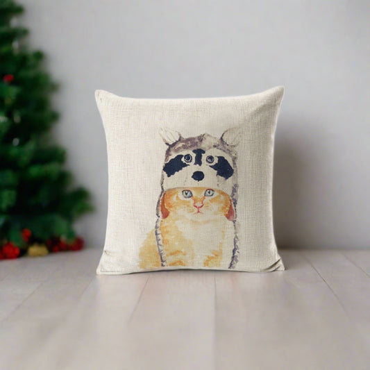 Yellow Tabby Cat With Raccoon Hat Pillow Cover
