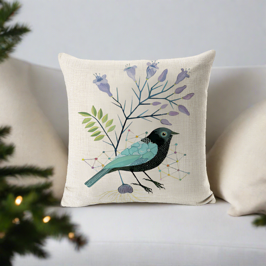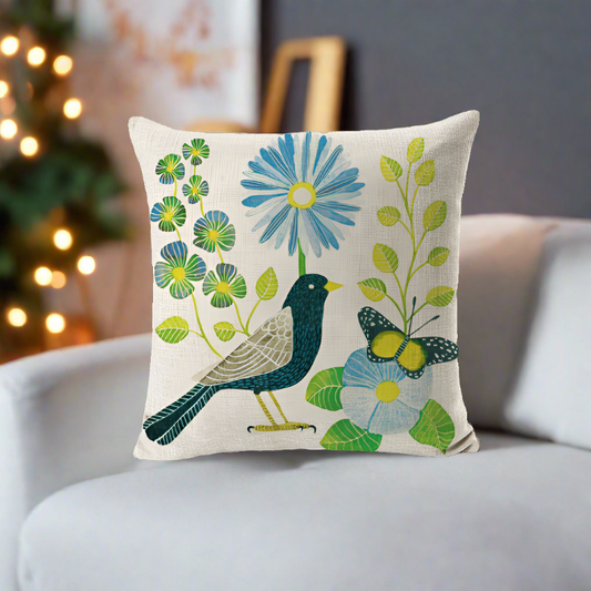 Green Bird With Green Leaves and Blue Flowers Pillowcase