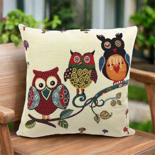 Vintage Graphic Three Cute Owls On Branch White Pillow Cover